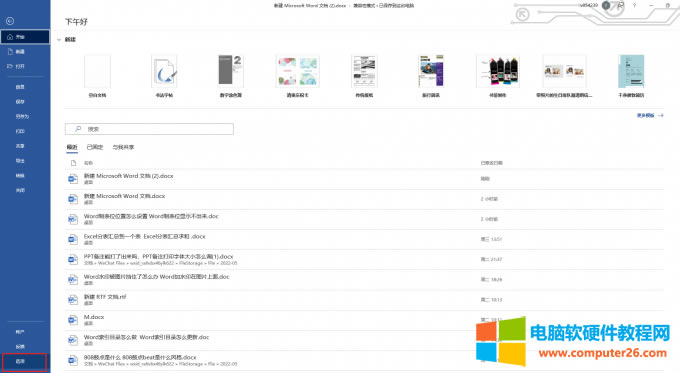 1、打开Word,点击软件上方菜单栏上的[文件]指令,在其工具栏上选择[选项]。