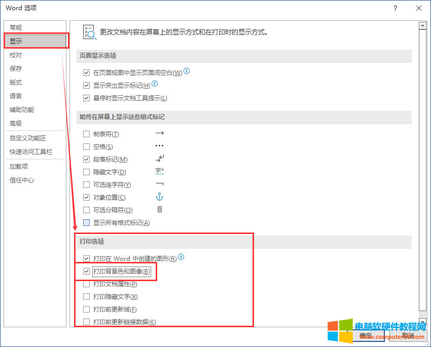 单击“文件”界面底部“选项”进入设置弹窗界面,单击左侧“显示”,在“打印选项”位置勾选“打印背景色和图像”,然后再返回打印,便可打印底色了(如图5)。