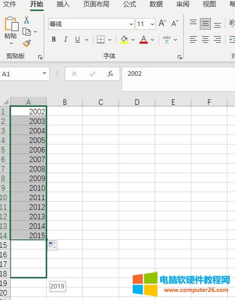 另一个很常用的输入数据方式是序列填充,在进行年份、编号等输入时,可通过包含已有序列(比如2002、2003、2004序列)单元格的方式,拖动填充柄实现序列填充。