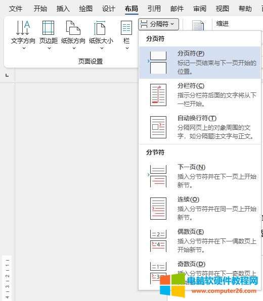 如图8所示,我们可在布局-分隔符功能中,使用“分页符”的方式添加空白页,保持整个文档的统一版式,避免页码错乱。