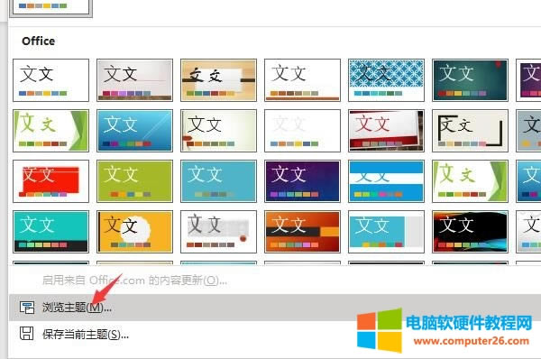 下拉列表中会显示一系列在线主题样式,不过这里我们需要导入自己的模板,所以直接点击底部的“浏览主题”就可以了。