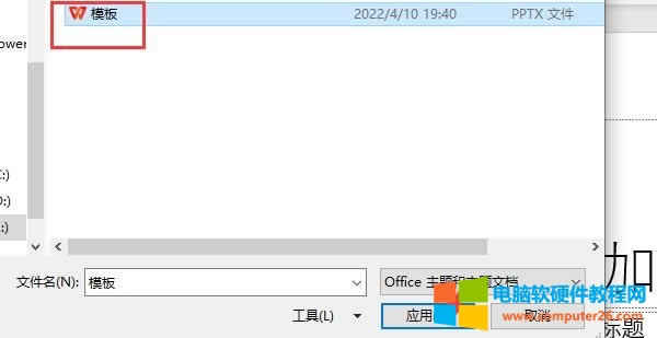 在弹出的文本框中,选中提前准备好的ppt模板,点击“应用”命令即可。