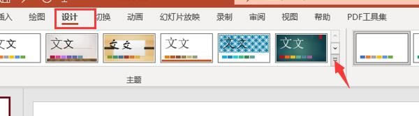 如图1所示,新建ppt文件后,进入主操作界面。切换到上方的“设计”选项卡,并点击右侧的下拉小箭头。