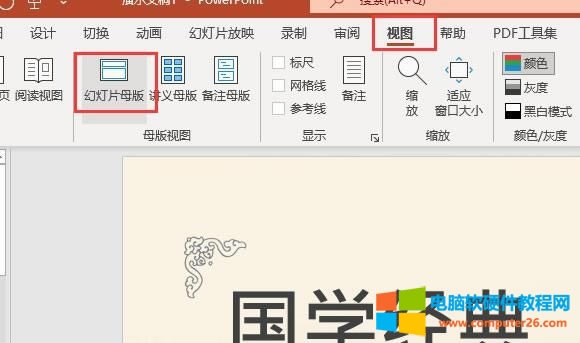 如图9所示,导入一份ppt模板后,我们切换到“视图”选项卡,点击其中的“幻灯片母版”命令。
