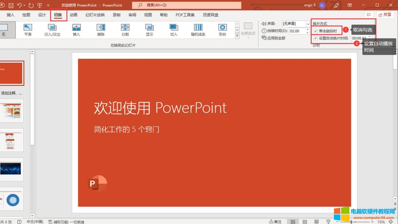 这里我们将介绍两种ppt自动播放的设置,即“切换”和“幻灯片放映”。