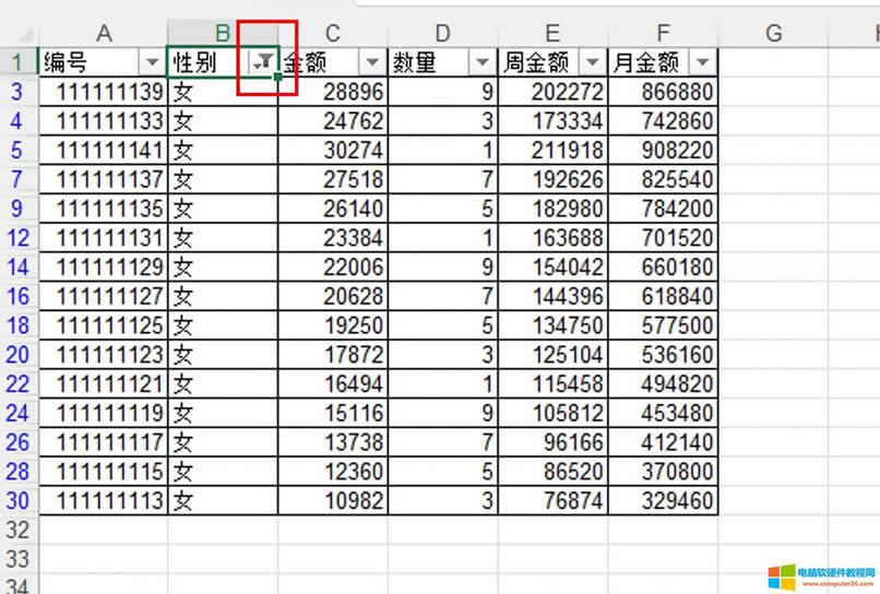 完成筛选后,如2所示,性别字段右侧会出现筛选图标,表示该字段包含筛选条件。