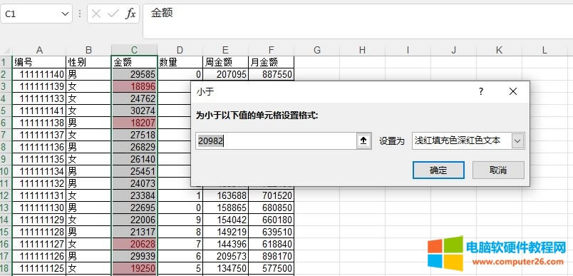 比如,为金额小于某个值的单元格设置颜色,可先选中“金额”所在的C列,然后依次单击突出显示单元格规则-小于选项。