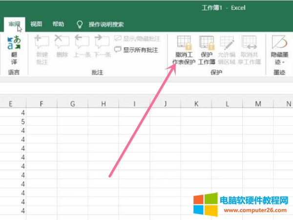 2、在审阅选项中,点击撤销工作表保护即可取消表格编辑受限。