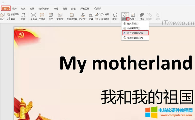 2、点击顶部的:插入--音频(向下的小三角)--嵌入背景音乐--选择电脑上下载好的音乐文件.mp3 或者 支持的其他音频格式文件--打开。