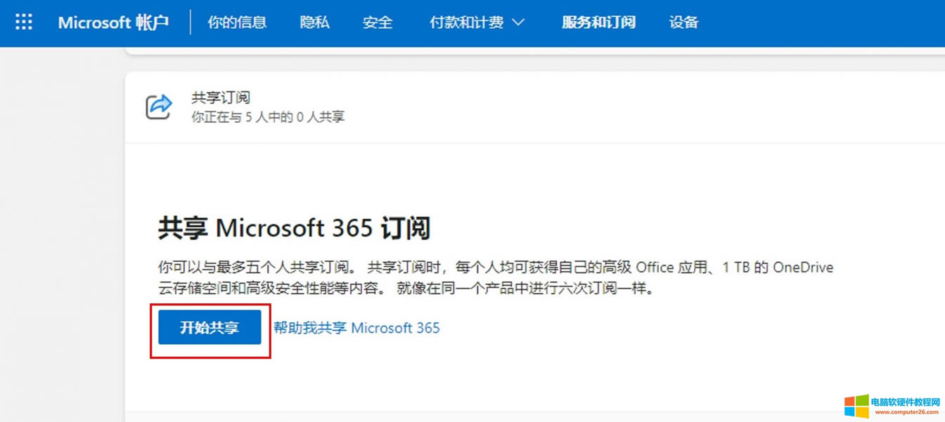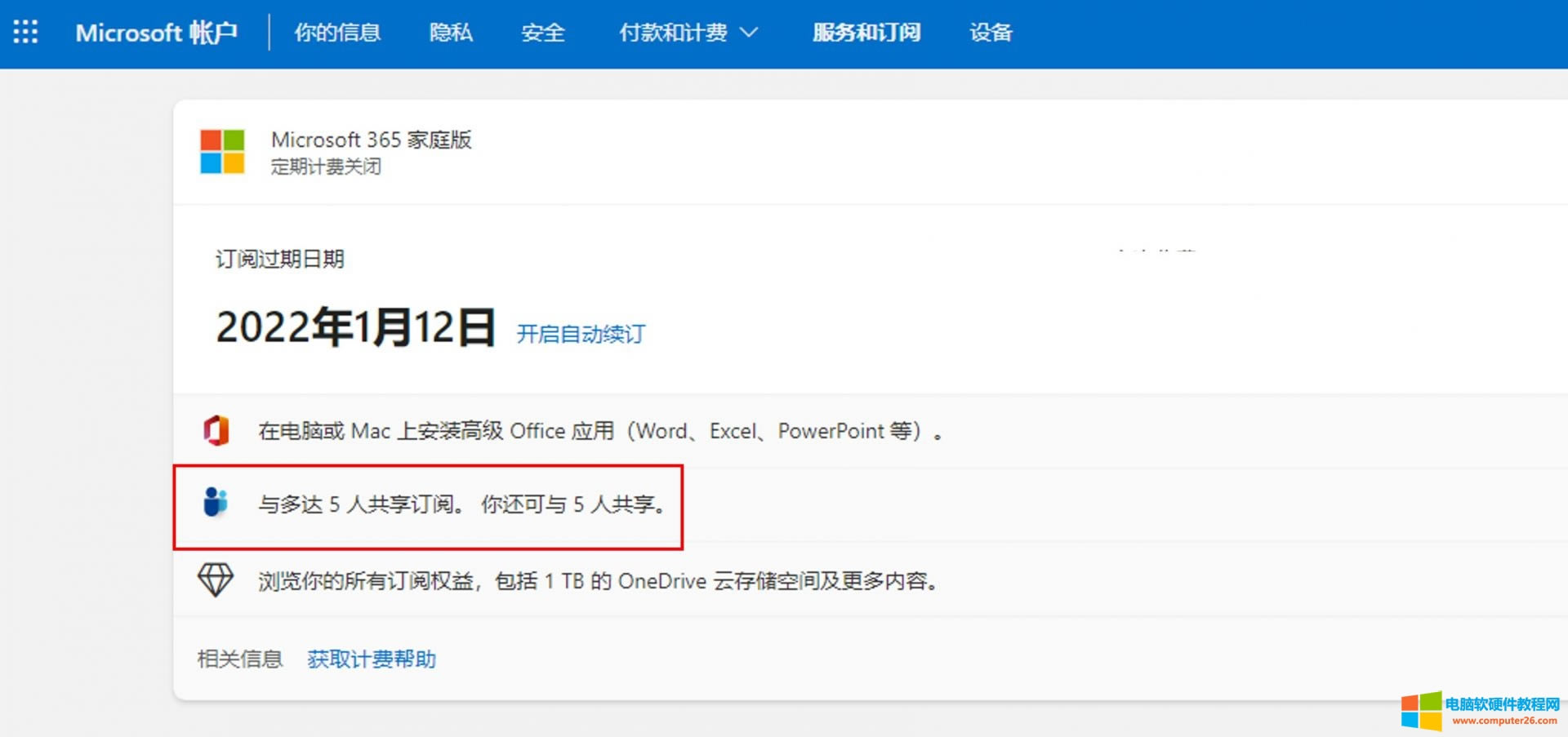 为了进行订阅共享的设置,我们需要单击“与多达5人共享订阅,你还可与5人共享”字样。