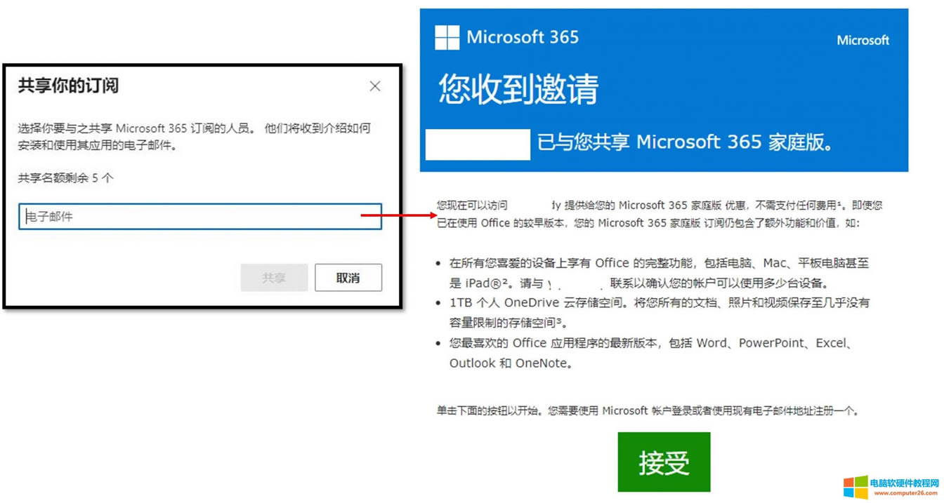 如果选择“通过电子邮件邀请他人”,如图7所示,需输入共享人的接收邮箱。Microsoft 365会自动给该接收邮箱发送共享邀请,共享人只需单击邮件中的“接受”按钮,即可享受订阅账号的权益,体验Microsoft 365提供的完整功能。