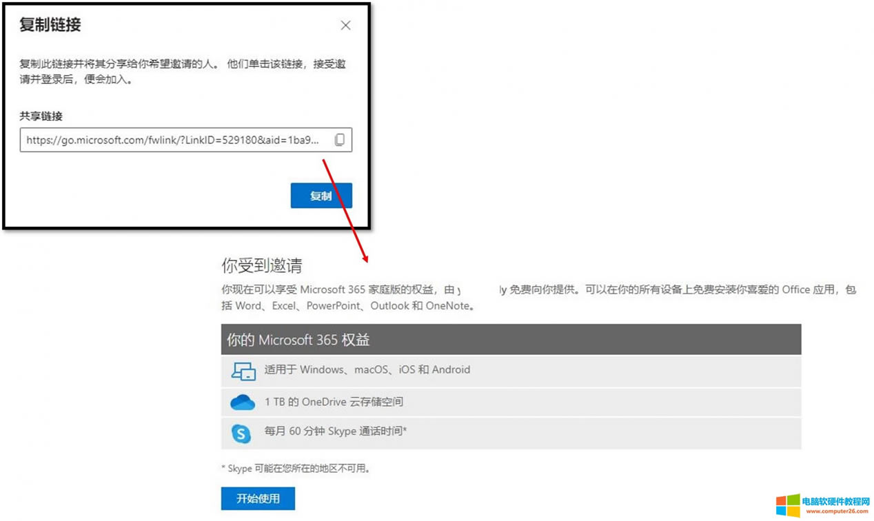 如果选择“创建要共享的链接”,如图8所示,只需将生成的共享链接发送给目标共享人,让他们打开链接对应的网站,接受邀请并完成登录操作后,即可享受订阅权益。