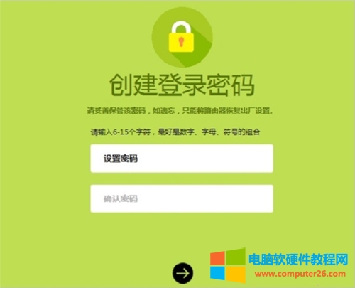 ②创建登录密码。按下回车键后,会弹出如下图所示的页面,提示设置登录密码。用户自己为你的路由器设置一个登录密码,然后点击向右的箭头。