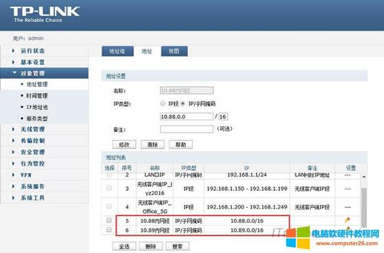 给点击对象管理——地址管理——地址,在地址设置中,自定义受控制地址的名称,并填写对应的IP地址10.88.0.0/16,点击新增。如下图所示: