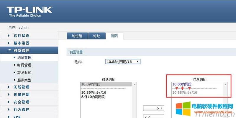 点击对象管理——地址管理——视图,在视图设置中,把设置好的地址添加到相应的地址组里面。如下图所示: