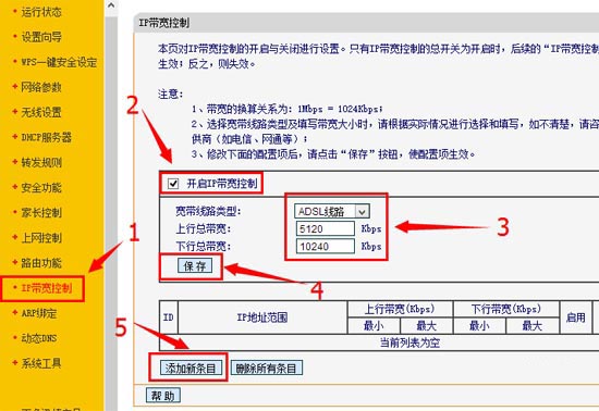 2、设置限速:点击“IP宽带控制”---->勾选“开启IP宽带控制”---->在“宽带线路类型”后面选择你的上网方式---->在“上行总带宽”填写:5120——>“ 下行总带宽”填写10240---->然后点击“保存”---->点击“添加新条目”。