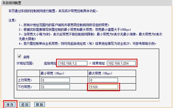 3、勾选“启用”——>在“起始地址”填写:192.168.1.2——>“结束地址”填写:192.168.1.254——>在“最大宽带”与“下行宽带”的交叉处填写:5120——>最后点击“保存”。