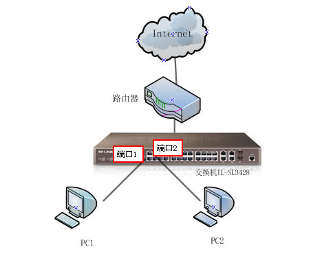 设置步骤以接入PC1和PC2接入1、2号端口为例,实际则以公司需要接入的主机数目为准,如下图: