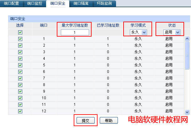 【1】二层交换>>端口管理>>端口安全 所有端口开启端口安全,最大学习地址数为1,学习模式为永久,如图:
