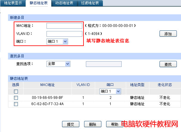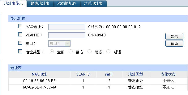 【2】端口学习到的所有信息会在“地址表管理”显示,如图,地址信息: