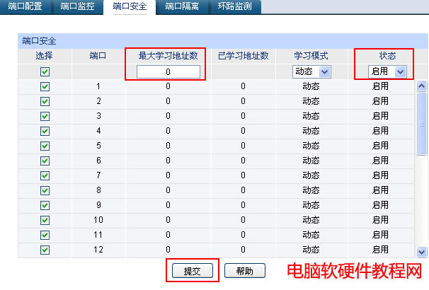 【2】二层交换>>端口管理>>端口安全 所有端口开启端口安全,最大学习地址数为0,如下图: