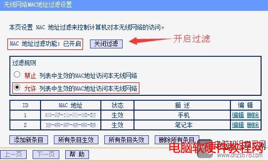 还是在刚刚的“无线设置”下,有个叫“无线MAC地址过滤”,选择“启用过滤”,在过滤规则下选择“允许”,然后点击“添加新条目”,输入自己上网设备的MAC(物理)地址,然后点击保存即可。