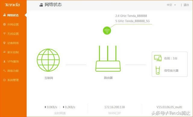小Tips腾达路由器设置界面IP地址都是192.168.0.1.当手机/平板电脑通过时WiFi或网线连接到路由器后,在任意一个浏览器的地址栏输入该管理IP地址可以进入路由器的设置界面。设置界面主要用于路由器的首次配置。配置上网后,大部分管理功能可以通过Tenda WiFi”APP来实现。