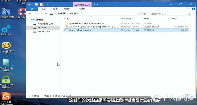 制作系统启动U盘(这里我用的微PE),一个作为软路由mini小主机(插入鼠标键盘和显示器)OpenWRT的img图像文件(这个版本很多,我选的是eSir大神的高大全固件),physdiskwrite写图像文件的工具。
