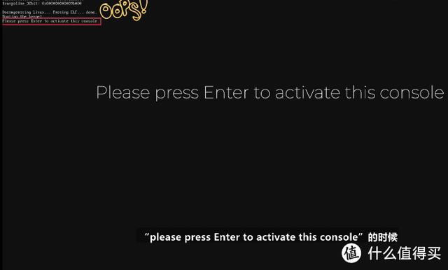 2.1、当看到please press Enter to activate this console软路由在此提示时启动。(Esir固件不跑码,看不到全屏代码不用慌。),系统安装完毕,直接按回车。