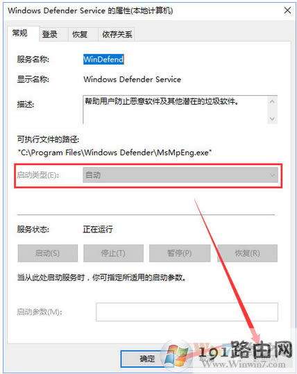 3、将启动类型修改为“自动”,点击“应用”然后点击启动 ,最后确定(按此步骤将其他2个服务开启),然后重启计算机即可正常运行Windows Defender 。