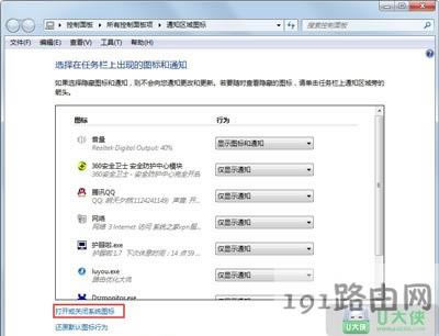 3、也可以选择下方的“打开或关闭系统图标”,再选择“音量”栏目,在行为上选择“打开”。或许选择下面的“还原默认图标行为”找回声音图标。