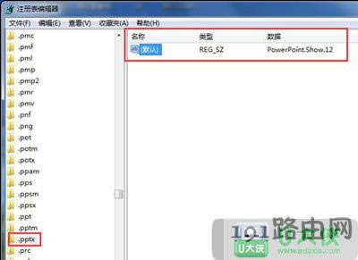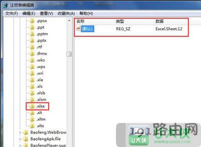 7、按照同样的方法,我们进入注册表寻找“xlsx”的位置,并将(默认)改为Excel.Sheet.12;然后寻找“pptx”,将(默认)改为PowerPoint.Show.12。