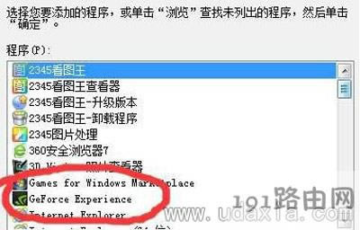 5、在程序框中选中“GeForce Experience”,然后点击“添加”;