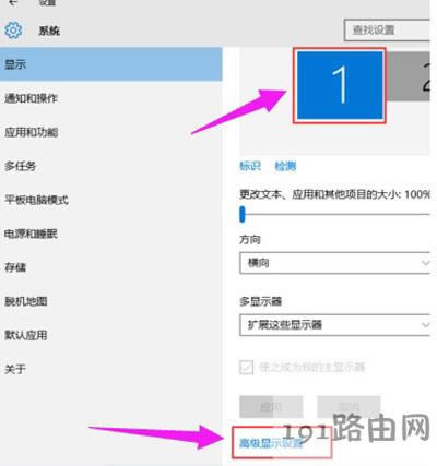 6,分别选择显示器1和显示器2,点击高级显示设置。