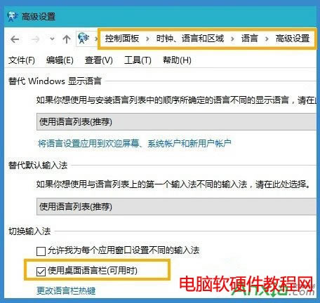 1、首先确保在控制面板中已经选中了“使用桌面语言栏”,具体方法:按Win+X—控制面板—时钟、语言和区域—语言—高级设置,勾选“使用桌面语言栏”,保存。