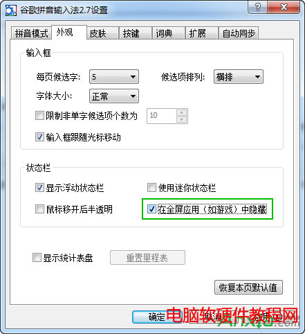 打开谷歌拼音输入法设置界面,切换到“外观”选项卡,勾选“在全屏应用(如游戏)中隐藏”,点击确定按钮退出即可。