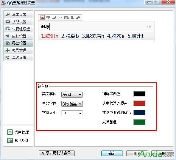 1、打开QQ五笔输入法的设置,然后在左边找到“界面设置”,点击。进入到“界面设置”界面,我们可以对QQ五笔输入法的外观进行设置,设置的内容有:“颜色”,“字体”,“字体大小”,我们可以根据自己的爱好进行设置。