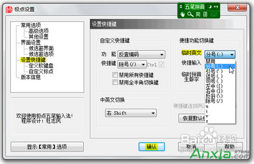 2、将临时英文的快捷键设定为你习惯用的符号(这里设定的是分号;)设定完成确认退出