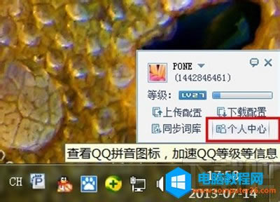 3、好了,接下来,在我们使用自己的QQ号码,登录QQ拼音输入法软件以后,点击“个人中心”。注意:在我们安装QQ拼音输入法软件之后,一定要记得登录自己的QQ账号哦,不然真的是没有积分记录的,也就没有等级这个说法了,切记切记。