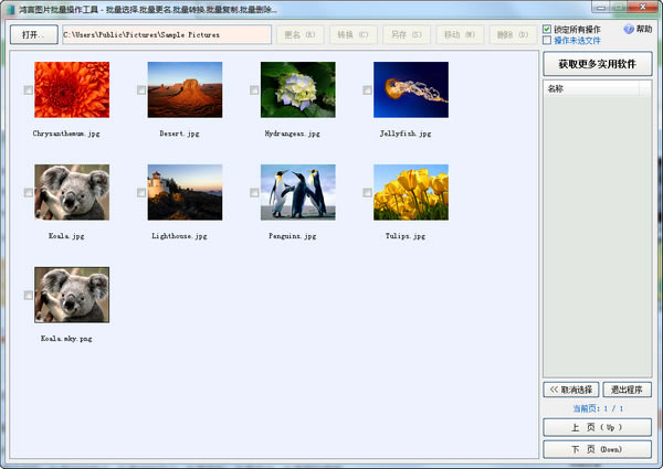 鸿言图片批量操作工具是一个共享软件,它以批量操作图片为重点,使用户可以对保存在电脑中的大量图片进行快速批量操作,包括批量选择图片、批量更改名称、批量转换格式、批量转换尺寸、批量复制、批量移动、批量删除等等。