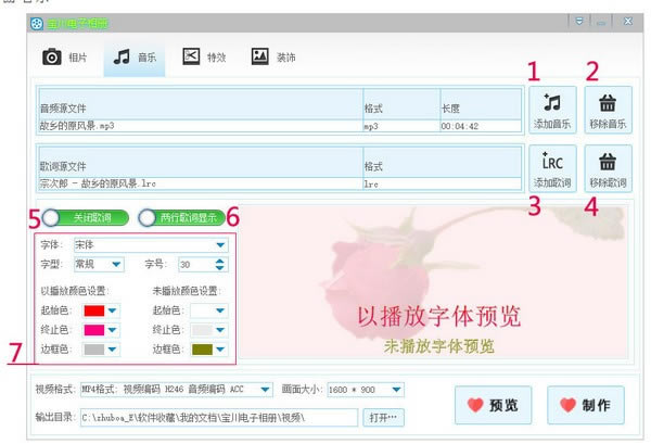 2.音乐 添加移除音乐歌词,对进行歌词设置。