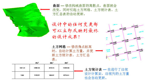 在以往的设计过程中,当设计完成、各种表格都生成后,发现某些数据(如自然标高或设计标高)需要调整,通常的做法是把自然标高和设计标高修改后,再把相关联的部分重新做一遍(如重新计算土方量),表格也要删掉重新生成,较为繁琐,是一件令设计人员很为头疼的事情。土方计算的动态更新机制则简化了这一过程,使设计后的修改变为一件极为轻松的事情。