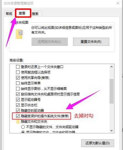 打开,在“查看”那一栏中把“隐藏受保护的操作系统文件”前面的√去掉,点击:确定。