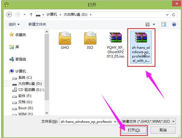 找到存放在制作好的大白菜u盘启动盘中的原版xp系统镜像包,点击“打开(O)”进入下一步操作。