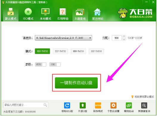 下载并且安装好大白菜装机版,打开安装好的大白菜装机版,插入u盘等待软件成功读取到u盘之后,点击“一键制作启动u盘”进入下一步操作。