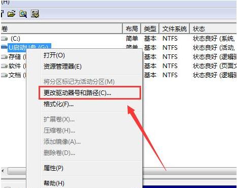 右键点击无法正常显示的u盘盘符,选择“更改驱动器和路径”的选项。