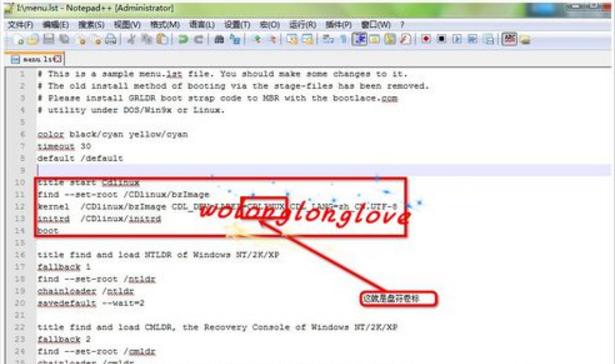打开U盘——打开menu.lst(记事本就行,需要管理员权限)