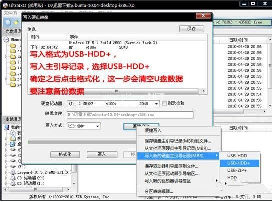 2,之后弹出一个小窗,选择格式为USB-HDD+,写入主引导记录,选择USB-HDD,确定后点击格式化,注意了,点击后要格式化U盘,如果U盘的资料还需要的话,建议转移出来