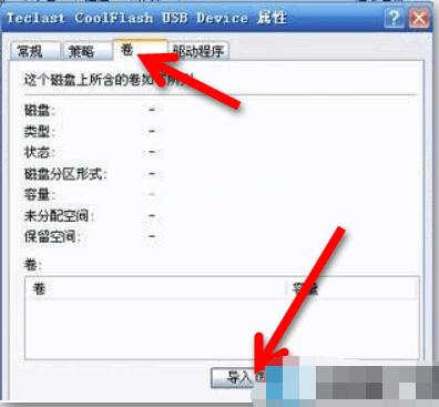 4,弹出窗口中,我们选中“卷”选项卡,再点击“导入”。