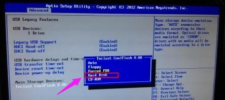 在Advanced界面,选择识别到U盘项,回车,选择USB或Hard Disk,回车